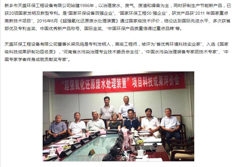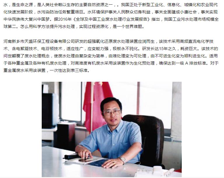 中國高新技術(shù)網(wǎng)發(fā)布:《關(guān)注:解碼科技創(chuàng)新》——新鄉(xiāng)市天盛環(huán)?!俺瑥?qiáng)氧化還原廢水處理技術(shù)”